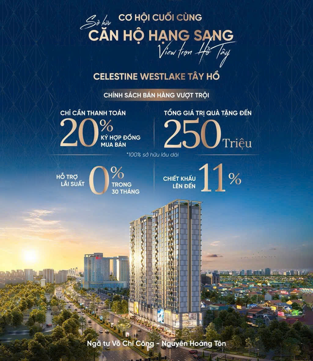 Hãy để mỗi buổi chiều trở thành tuyệt tác ngay trong chính phòng khách nhà bạn tại chung cư Celestine Westlake. Nơi bức tranh hoàng hôn Hồ Tây huyền ảo không còn là cảnh đẹp phía xa, mà là một phần trải nghiệm sống độc bản, quý giá. Với phiên bản giới hạn chỉ 216 căn hộ, mật độ thấp 6 căn/sàn và thiết kế kính Low-E chạm sàn đẳng cấp, không gian sống của bạn hòa quyện hoàn hảo cùng thiên nhiên kiệt mỹ. Kiến tạo bởi VINAENCO uy tín, Celestine Westlake định danh chuẩn mực sống thượng lưu mới tại tâm điểm quận Tây Hồ.